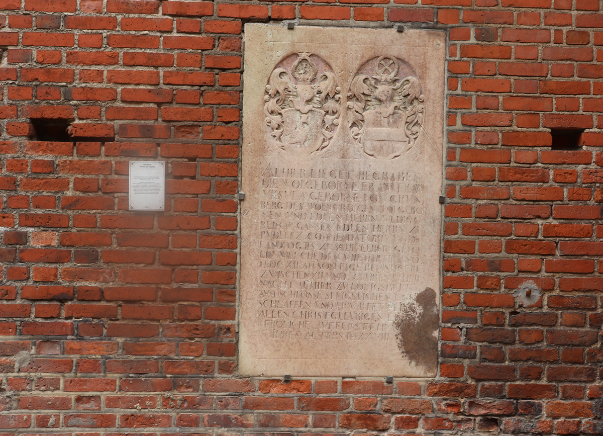 Благороднорожденная госпожа Урсула, по всей видимости, приехала с мужем в Пруссию из Германских княжеств, где у мужа и у нее имелись небольшие владения. Отец Урсулы Захария фон Грюнберг был губернатором Кюстрина, одной из бранденбургских крепостей. Да и супруг был приближенным Иоанна Сигизмунда, его глазами и руками в Пруссии. Муж Урсулы - Ведиго Реймар Ганс цу Пудлиц занимал в Кёнигсберге пост ландфогта, то есть был чиновником, вершившим суд на вверенных ему землях. Очень важная фигура для жителей окрестностей Кёнигсберга, как вы понимаете. Неудивительно, что жене такого важного человека нашлось место для ожидания «радостного воскрешения…» в самом намоленном месте – у собора, а эпитафию вделали в стену.