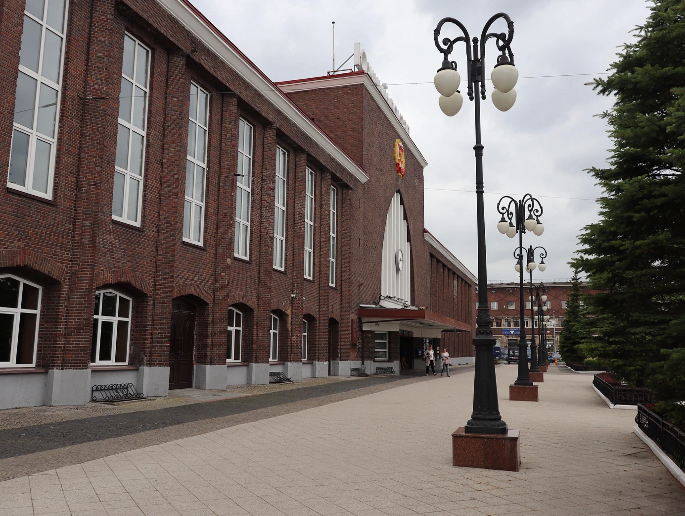 И что хорошо – вот это сочетание намека на неоготику с гербом РСФСР так и сохранится, потому что здание вокзала поставлено под охрану как памятник архитектуры. И следы штурма в апреле 1945 года – тоже. Они там видны в виде обновленной кладки, если приглядеться.